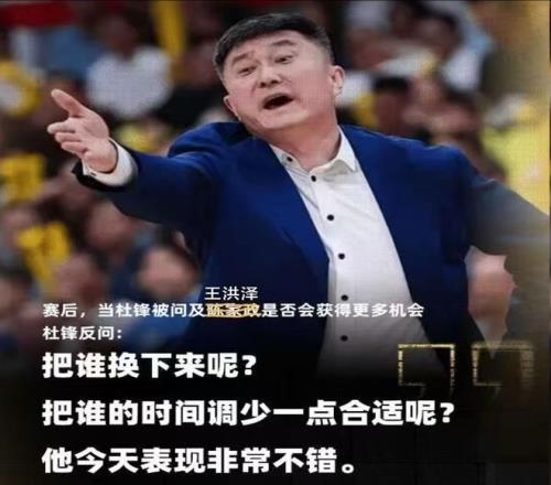 加时赛,王洪泽直接上演一记双手暴扣,帮助广东把领先优势扩大至4分。考虑到此前陈家政在对阵四川的比赛有着出色表现,在被问及是否能获得更多机会时,却在赛后被杜锋来了句:“那把谁换下来呢”。所以这场王洪泽打出优异表现,也让球迷调侃道:“赛后,当杜锋被问及王洪泽是否会获得更多机会?”
